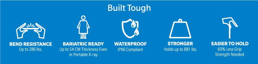 The lightweight, easy-to-hold design and rounded edges make rounds and bedside imaging more comfortable, minimizing the risk of accidental drops and slips and providing more comfort for the patient. In addition, water resistance and the high load capacity contribute to daily clinical work with peace of mind.